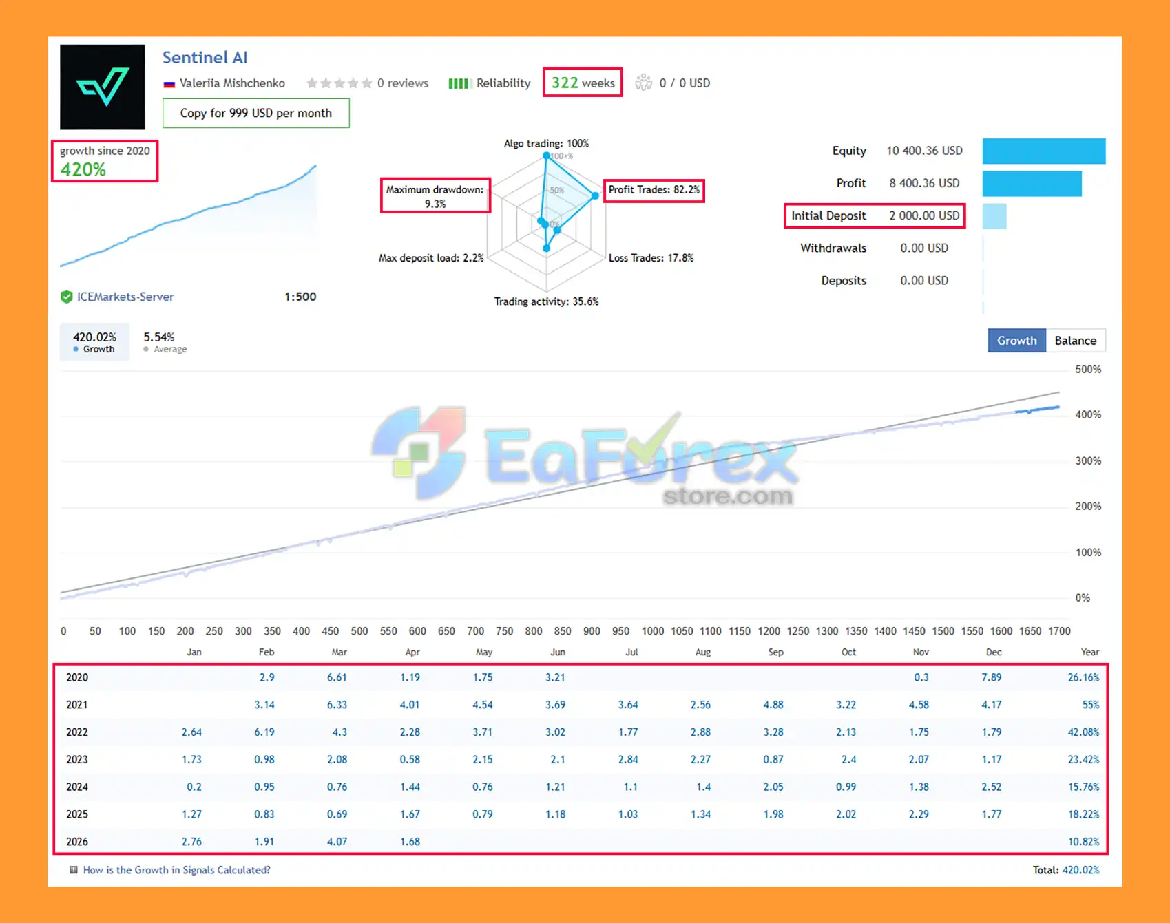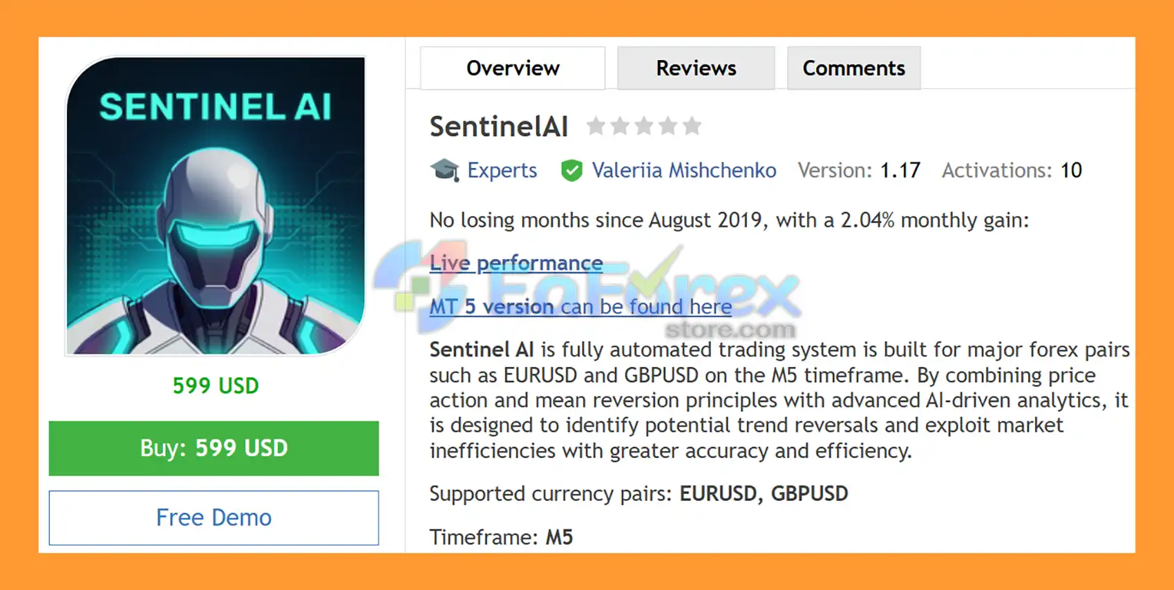 SentinelAI EA MT4 is a fully automated AI forex trading system for EURUSD and GBPUSD, using price action, mean reversion and smart filters for precision entries