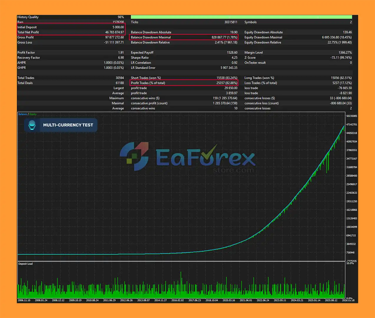 The EA is optimized for EURUSD and GBPUSD on the M5 timeframe. It can manage both pairs from a single MT4 chart setup, making it efficient and easy to use.
