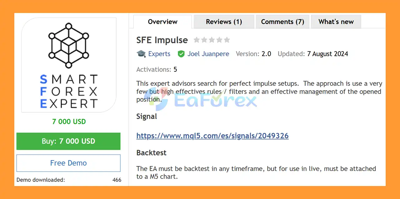 • Notable Products: SFE Impulse MT5, SFE Impulse MT4, SFE Swing EA MT5, SFE Raw Impulse MT5 and other advisors.