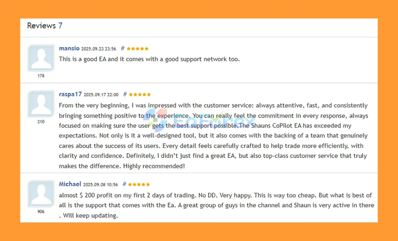 🔺Shauns CoPilot EA is highly appreciated by the MQL5 community for bringing stable and reliable profits. Below are 5 star reviews from users: