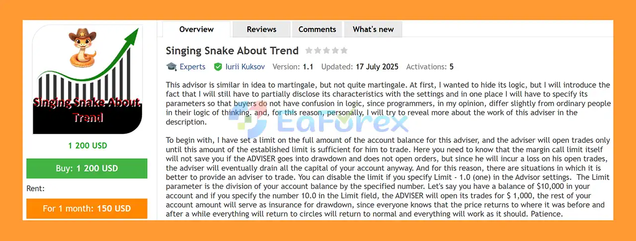 In summary, Singing Snake About Trend EA MT4 is a sophisticated and logic-driven Expert Advisor designed for traders who want controlled recovery trading without relying on blind martingale techniques. By using opposite-order balancing, balance protection limits, and trend-aware execution, this EA manages drawdowns intelligently while adapting to natural market fluctuations. With high customization, transparent strategy design, and flexible risk modes, Singing Snake About Trend EA MT4 is best suited for experienced traders seeking a structured, adaptable, and capital-conscious trend recovery solution on MetaTrader 4.