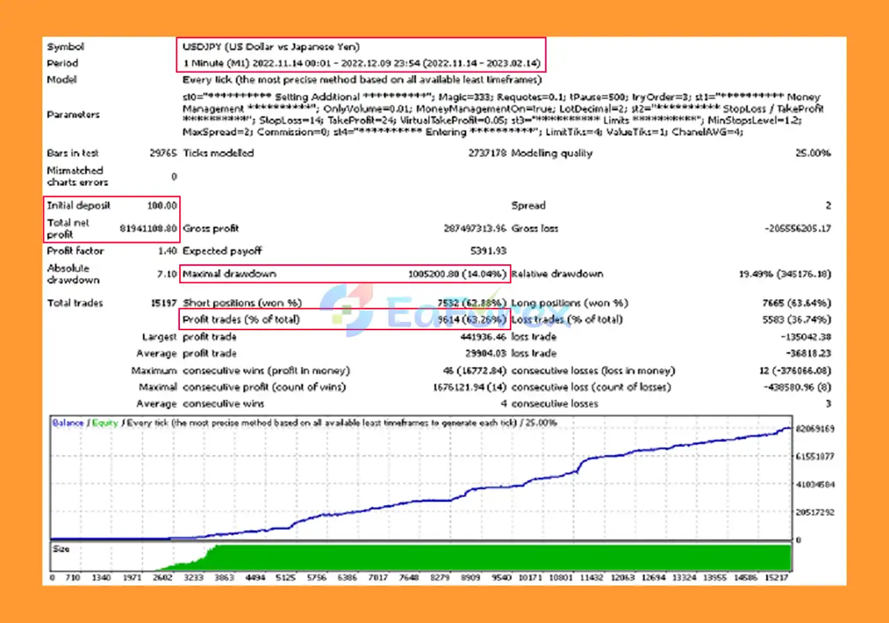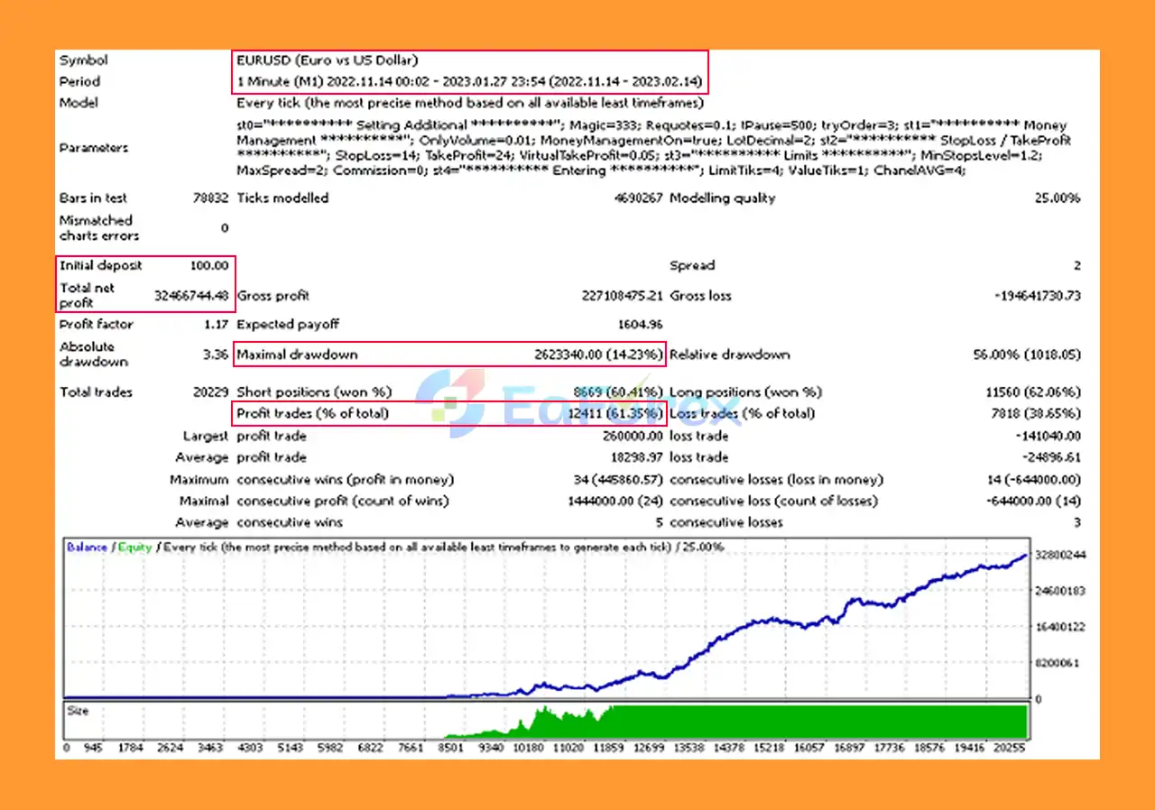 EURUSD: $100 → $32.466M, Win Rate 61.35%, Max Drawdown 14.23%