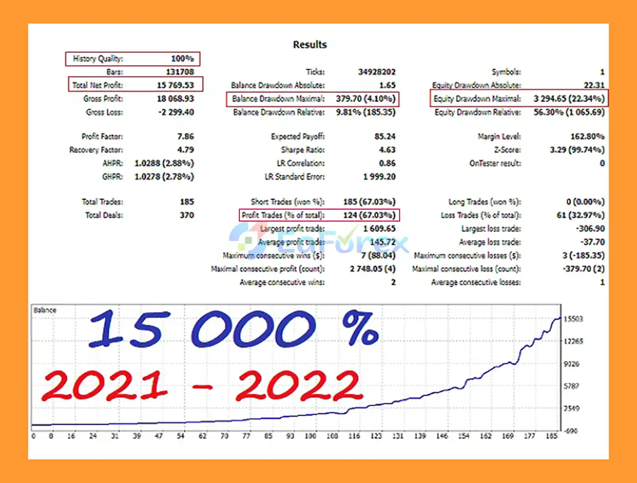 Backtests on EURUSD M5 over two years show a total net profit of $15,769.55 from an initial deposit of $100, with a 67% win rate and maximum drawdown of 4.1%.