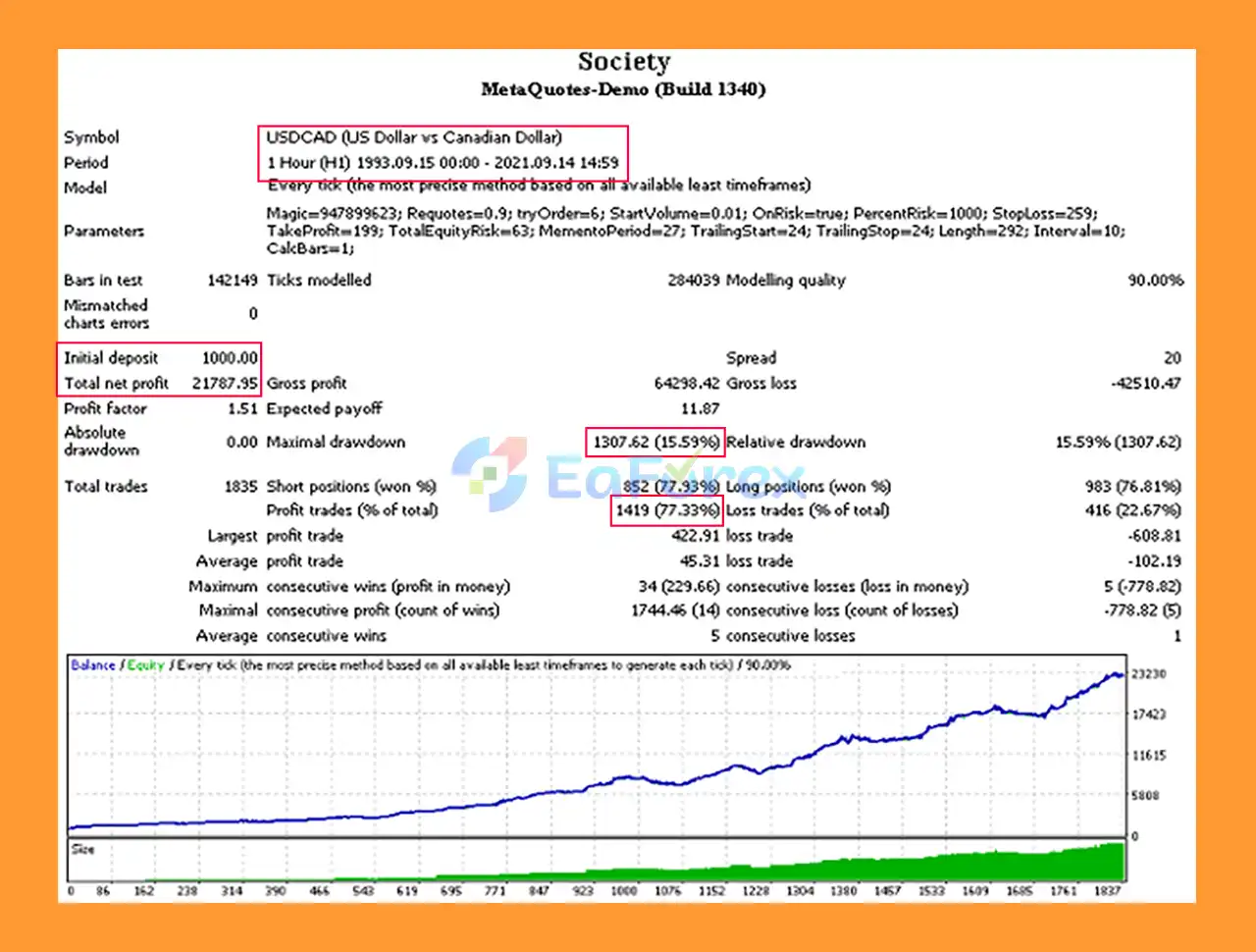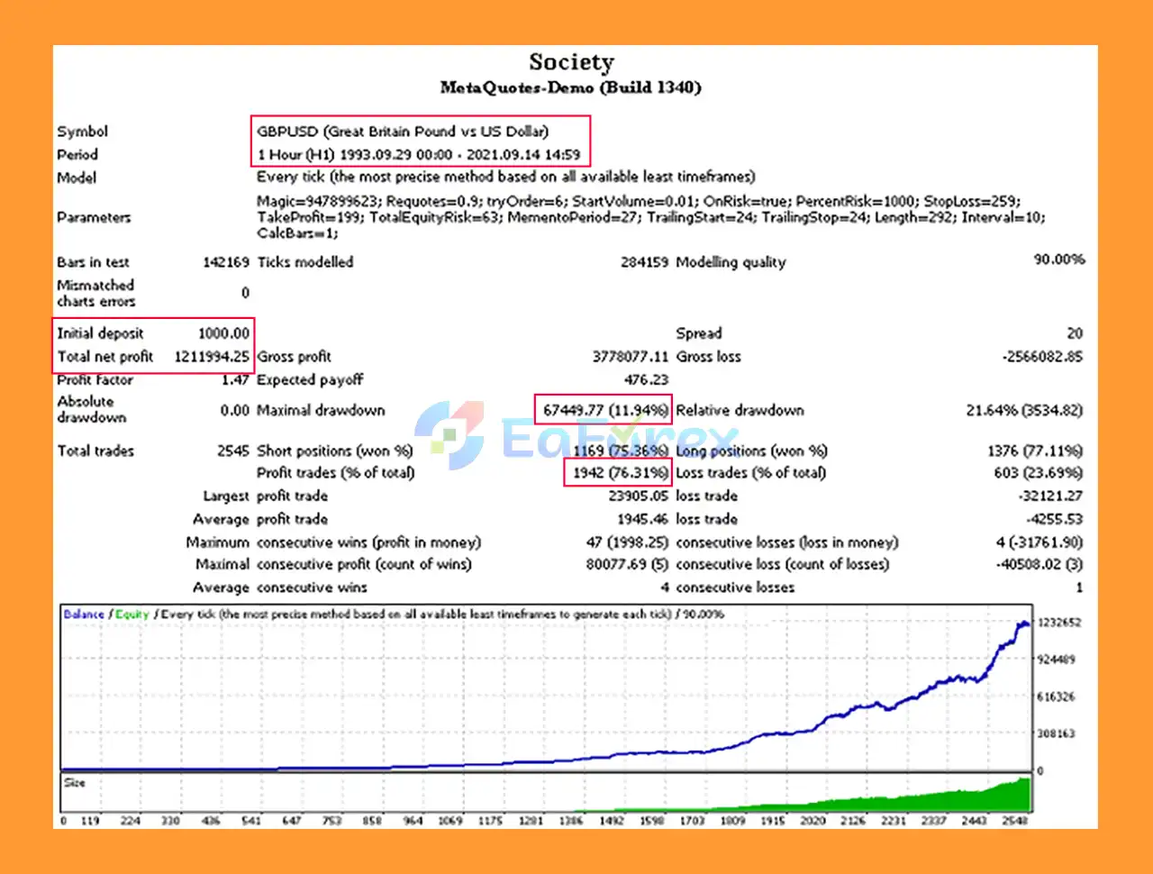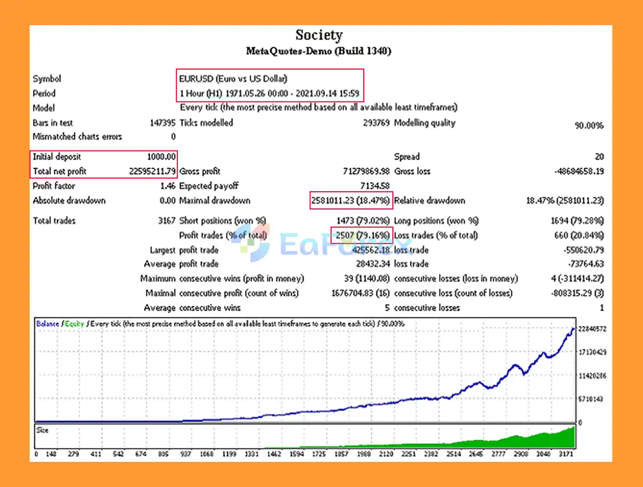 Society EA MT4 is primarily optimized for the H1 (1-hour) timeframe, which helps the EA identify stable market trends and avoid excessive short-term market noise.
