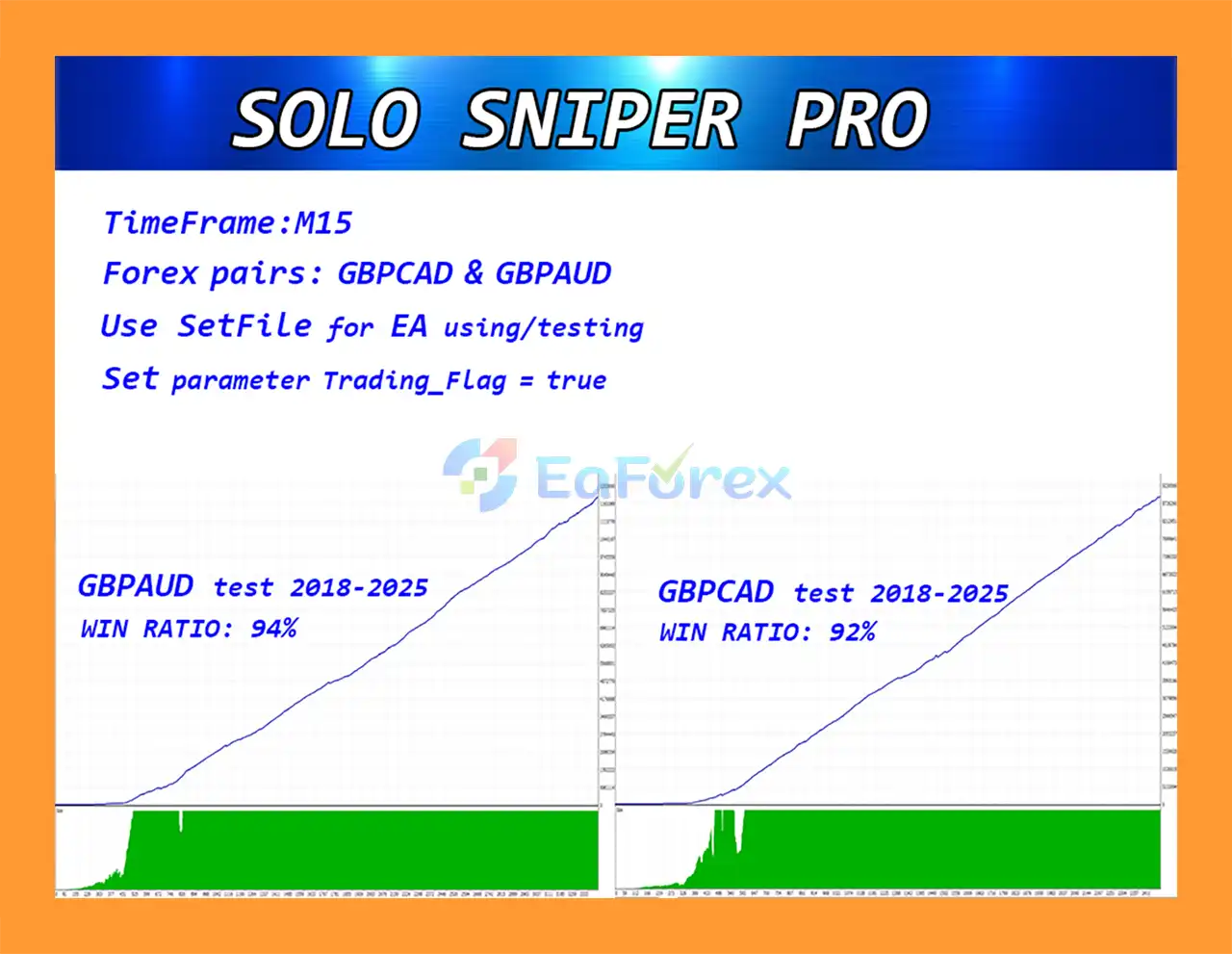 Solo Sniper Pro mf EA MT4 is a fully automated M15 scalping EA for GBPAUD & GBPCAD, using high-accuracy signals, dynamic SL, and compound-lot risk management.