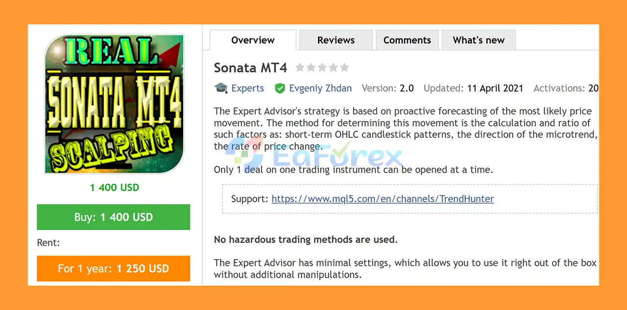 In summary, Sonata MT4 is a reliable and intelligent Forex Expert Advisor designed to provide precise, automated trading on M5 charts. By proactively forecasting market movements and applying strict risk management with Stop Loss, Take Profit, and trailing stops, Sonata MT4 allows traders to trade safely and efficiently. Its minimal settings, single-trade execution, and optimized performance on major currency pairs make it an excellent choice for hands-off, profitable Forex trading.