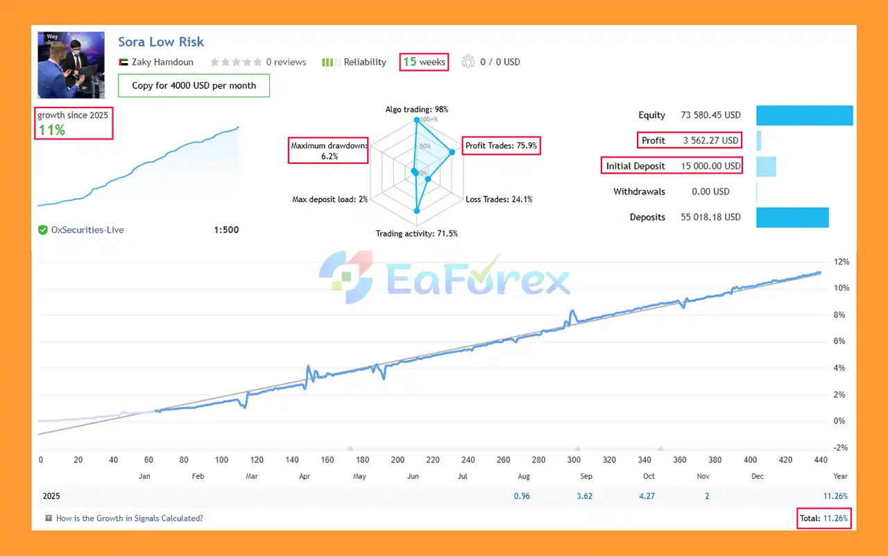 Sora Adaptive MT5 is backtested and live-proven, with 18+ months of live testing. Signal results show a 75.9% win rate, +11.26% growth over 15 weeks, and maximum drawdown of 6.2%.
