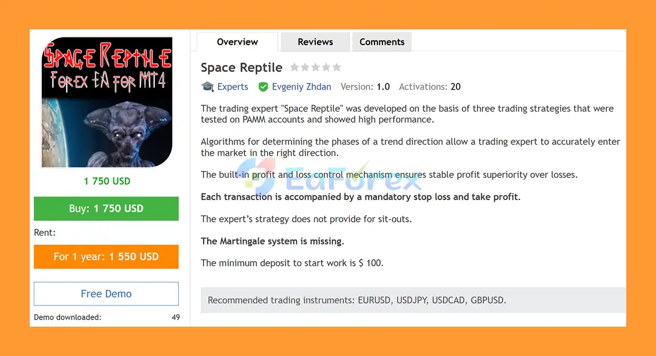 Space Reptile EA MT4 is an automated Forex trading robot that trades according to trend phases using three proven strategies. It features mandatory Stop Loss and Take Profit, ensuring disciplined risk management for both beginner and advanced traders.