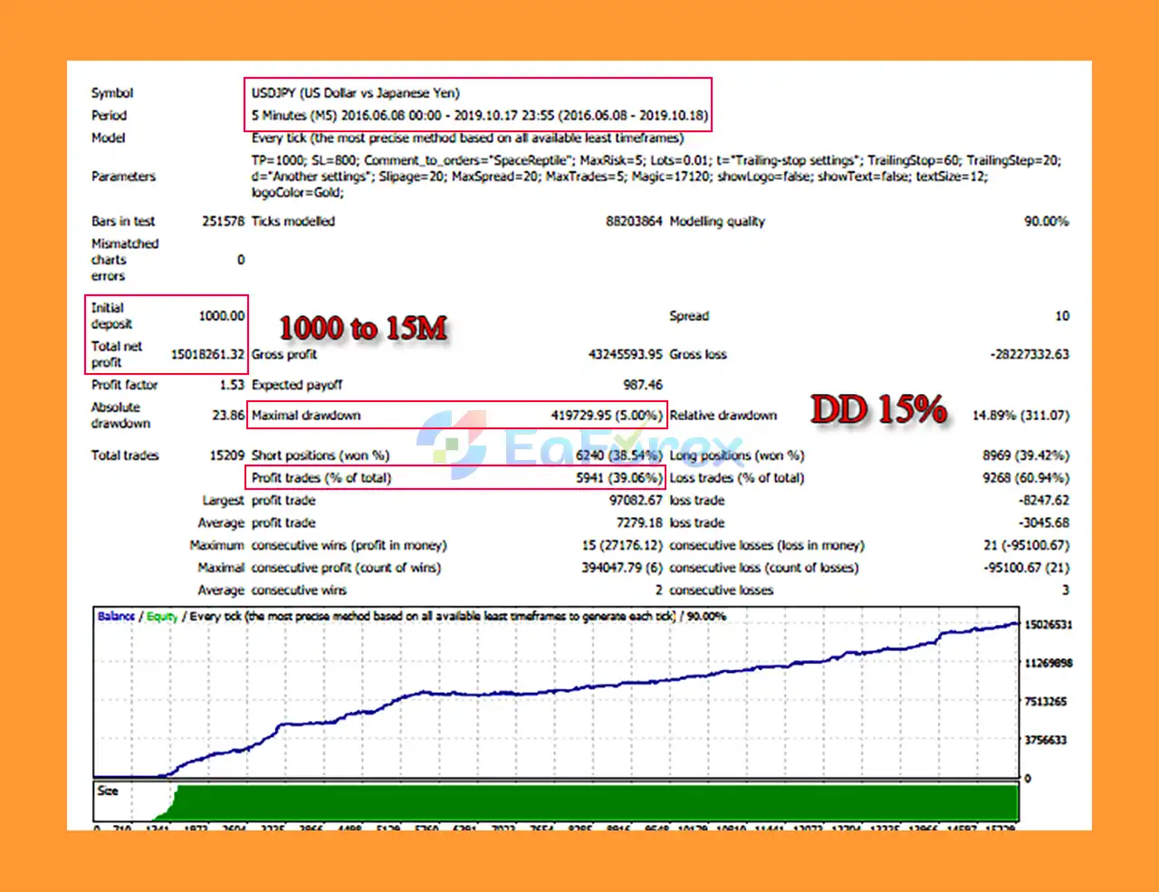 EURUSD: $1,000 → $407,641 net profit, Win Rate 38.74%, Max Drawdown 14.12%