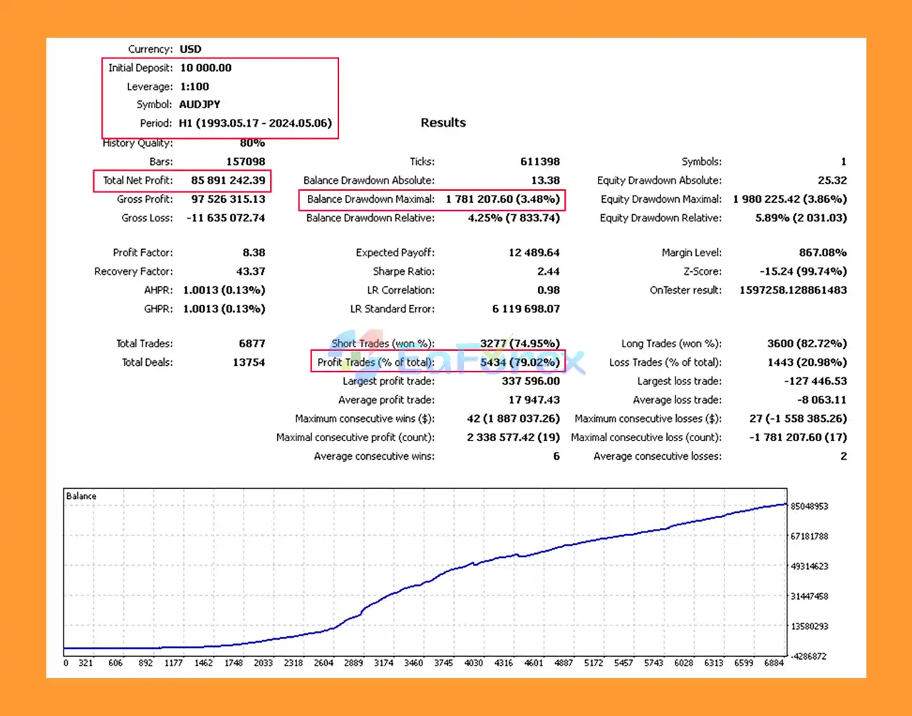 AUD/JPY → $85.981M net profit, 79.02% win rate, 3.48% max drawdown