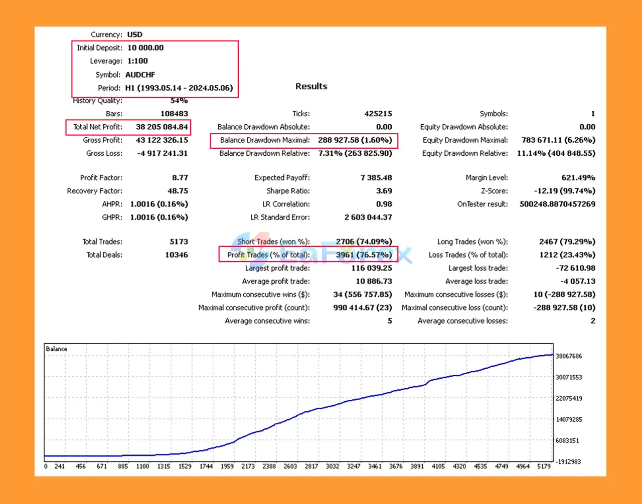 AUD/CHF → $38.205M net profit, 76.57% win rate, 1.60% max drawdown