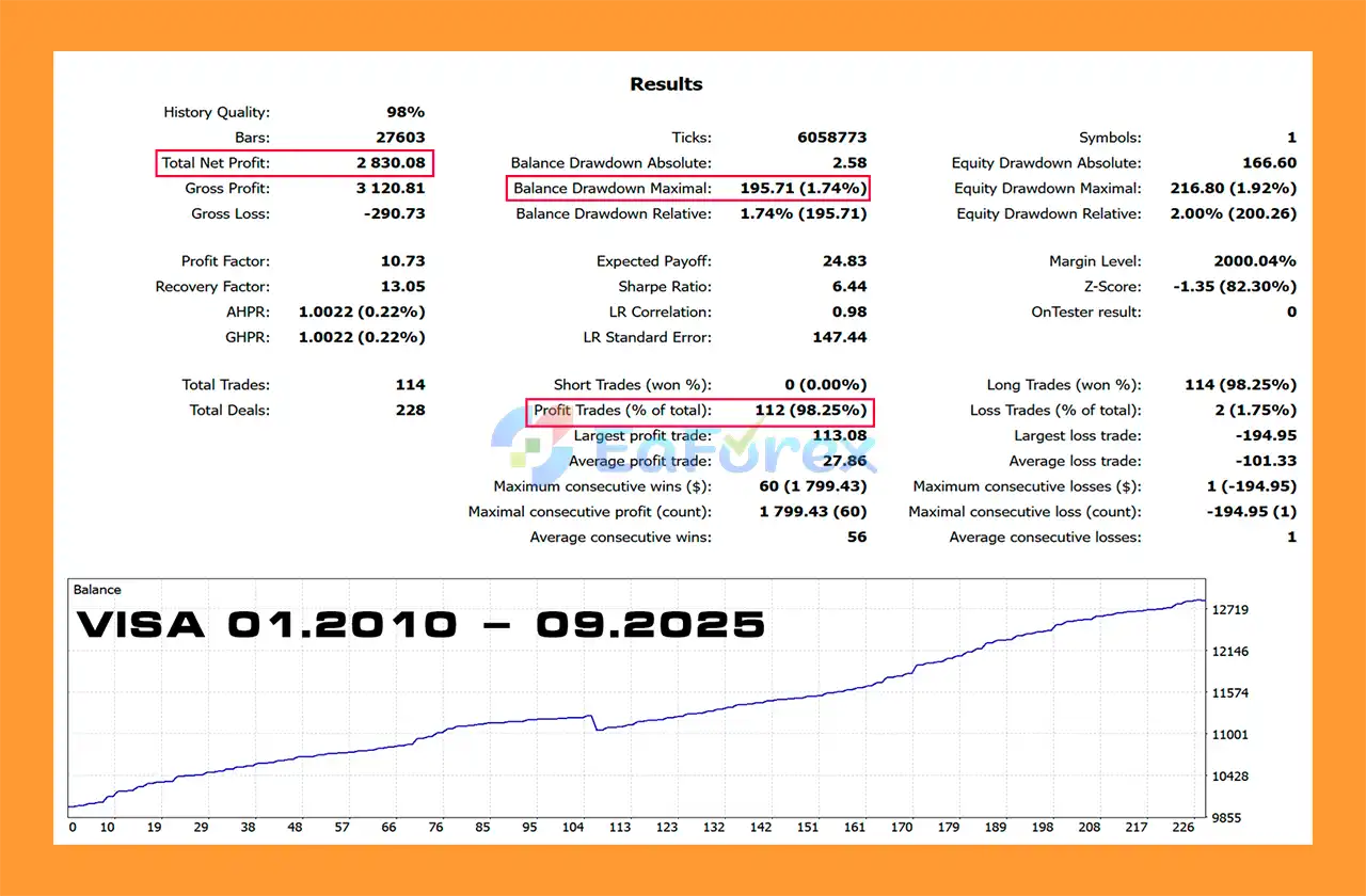 Risk management is built into every trade through fixed Stop Loss and Take Profit levels. The EA focuses on fewer, higher-quality trades, which helps maintain low drawdowns and stable equity growth over time.
