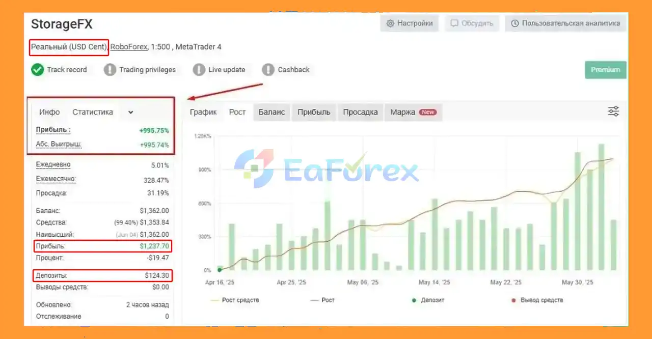 🔺 StorageFX EA demonstrates live verified performance on a USD Cent Account (MT4, 1:500 leverage) via Myfxbook, showing impressive growth in a short period.