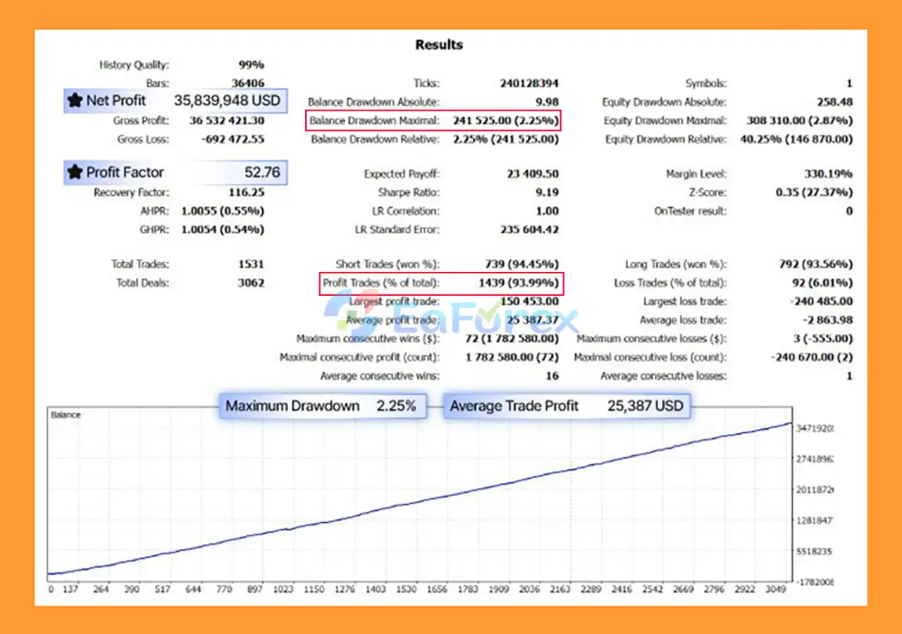 The EA is optimized for the H1 (1-hour) timeframe, balancing trading frequency and precision for effective long-term results.
