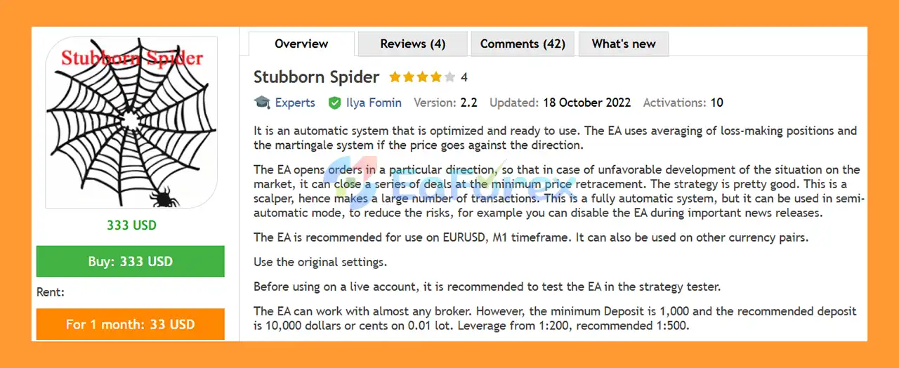 • Notable Products: Stubborn Spider MT4, Wise Scalper MT4, Extreme Point MT4 and other advisors.