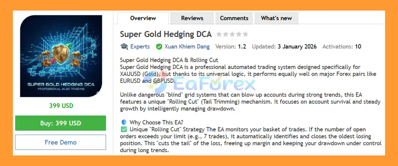 Super Gold Hedging DCA EA MT4 is a professional automated trading system built primarily for XAUUSD (Gold) but adaptable to major Forex pairs like EURUSD and GBPUSD. It combines hedging, DCA (Dollar Cost Averaging), and a unique Rolling Cut mechanism to manage drawdown and protect your capital while aiming for steady growth.