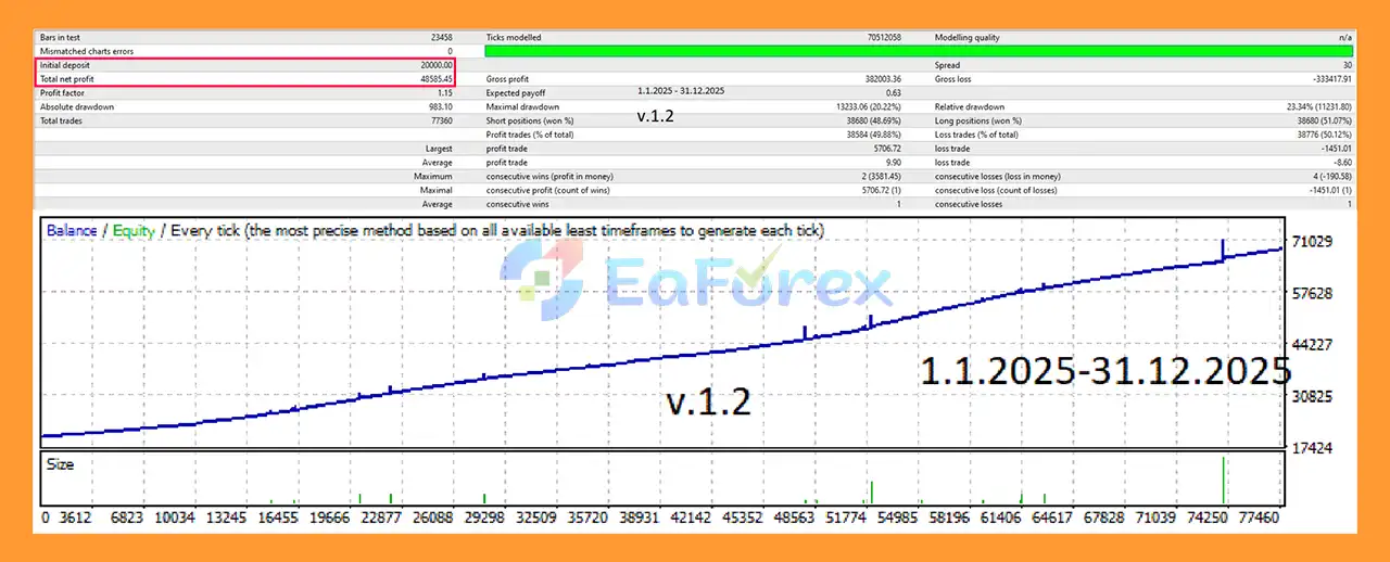 Backtests show that with a $20,000 initial deposit over 12 months, the EA generated $48,585.45 in net profit with a maximum drawdown of 20.22%, demonstrating disciplined growth and effective risk management.