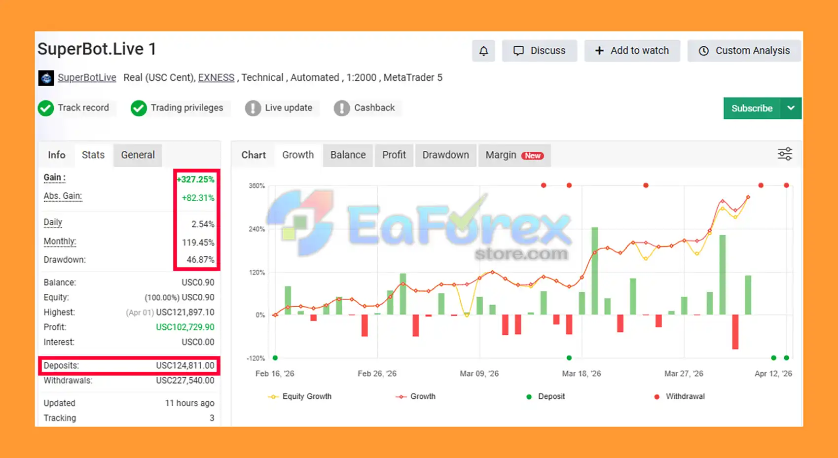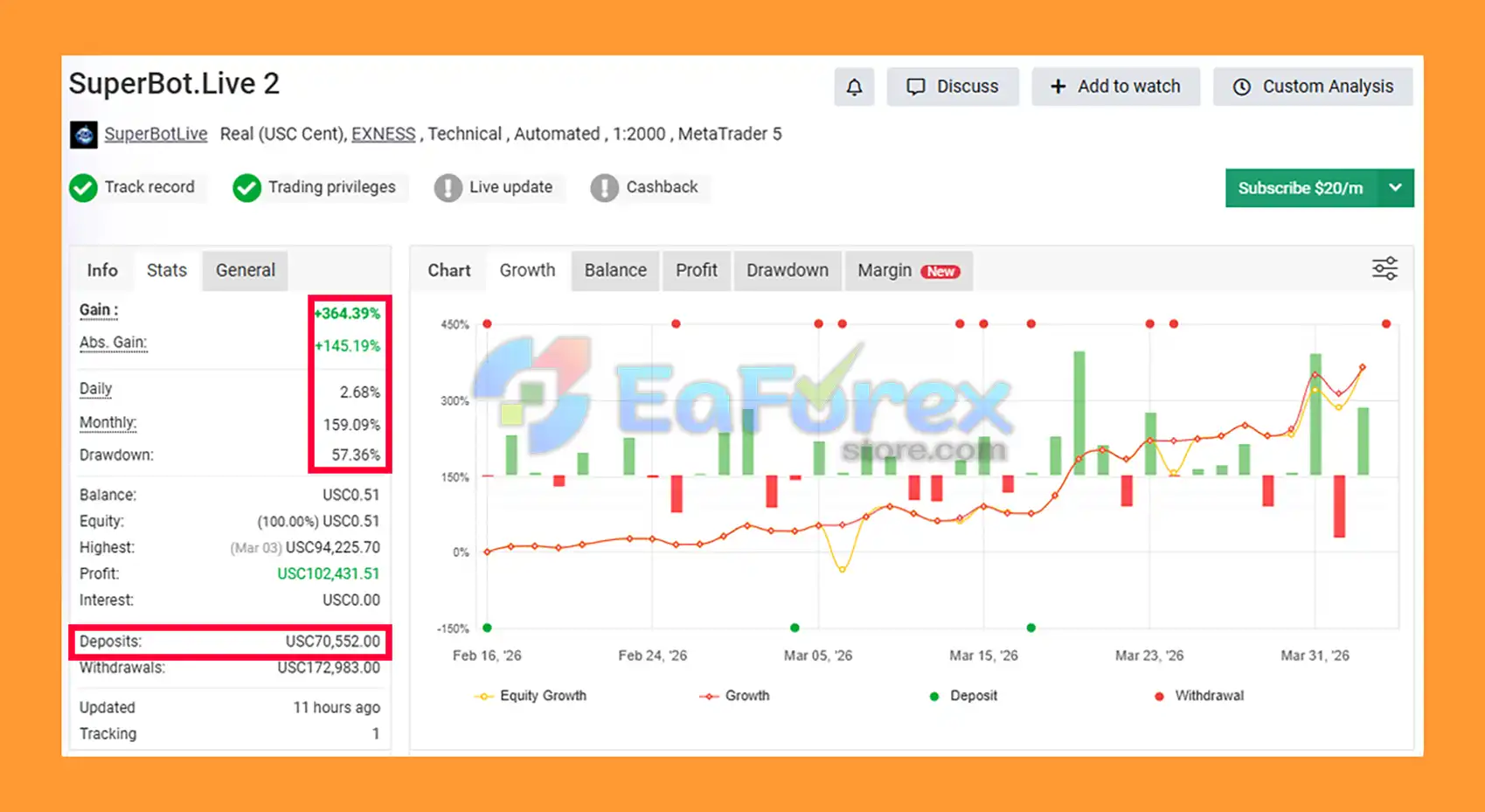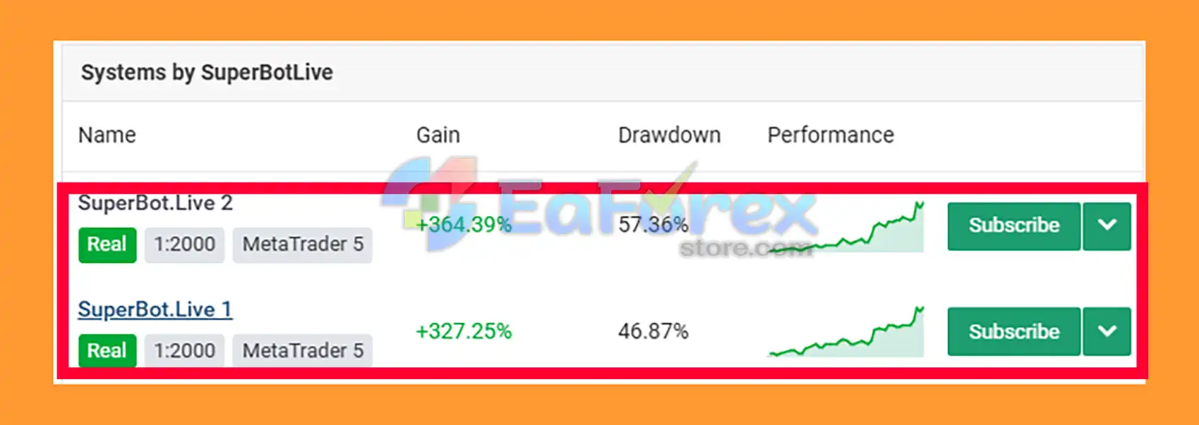 In summary, SuperBot Live MT5 is a powerful and fully automated Expert Advisor (EA) built for traders who prioritize stability, structured order execution, and long-term capital protection. By combining a pivot-based entry system, indicator confirmation, and disciplined price action logic, it ensures that every trade is executed under rigorous and clearly defined conditions. Without using grid or martingale strategies, the EA significantly reduces unnecessary risk while maintaining consistent trading behavior across varying market conditions. Verified results on MyFxBook further demonstrate its strong performance potential, showing high returns along with controlled capital loss in a real-world trading environment.