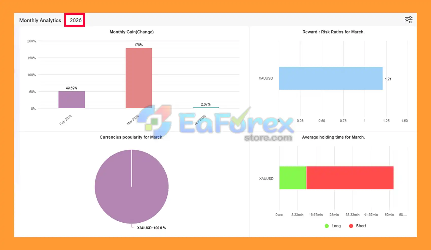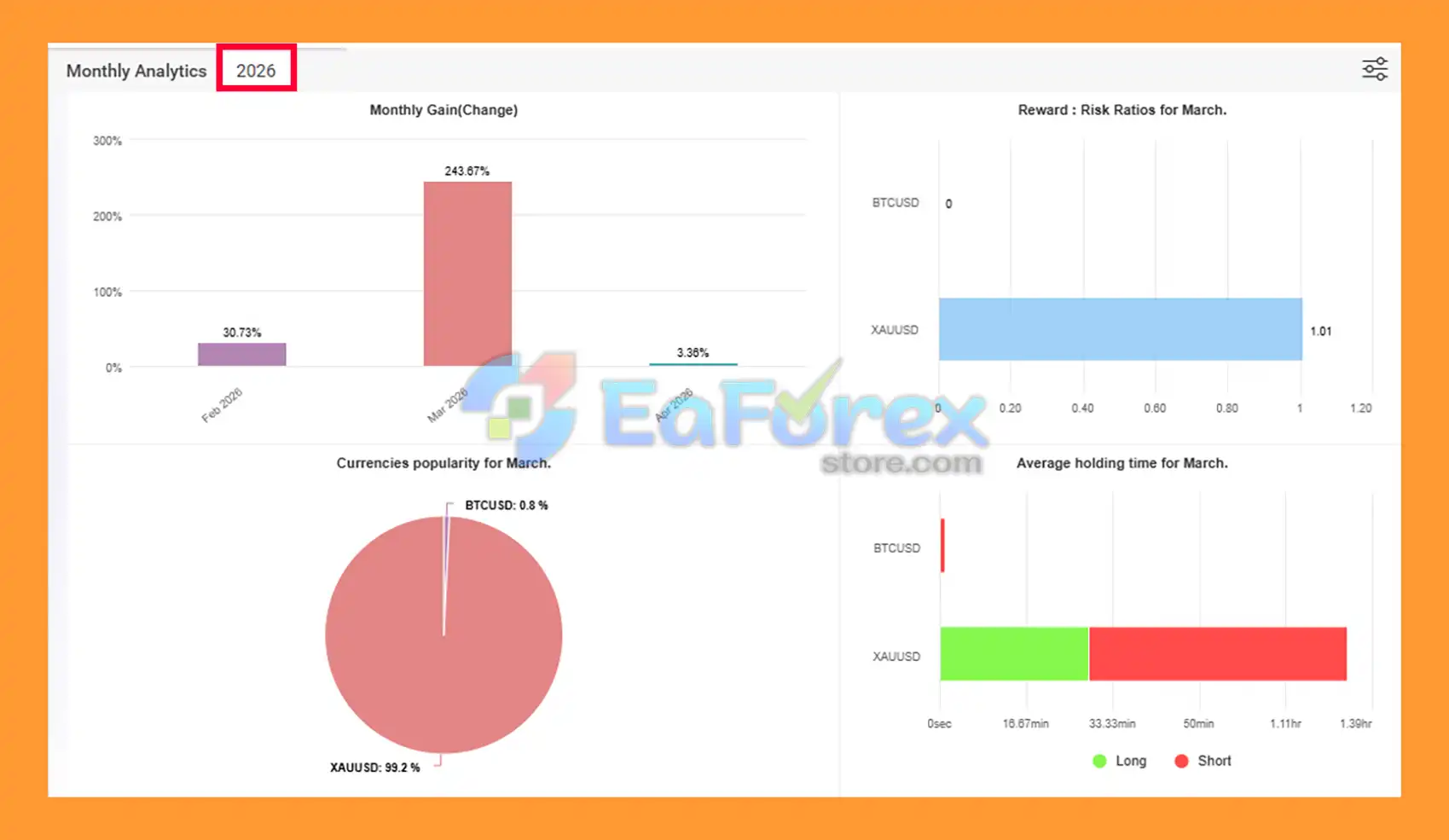 Based on MyFxBook data, the EA achieved up to +364.39% growth over 3 months on XAUUSD and BTCUSD, with controlled drawdowns depending on market conditions and account size.