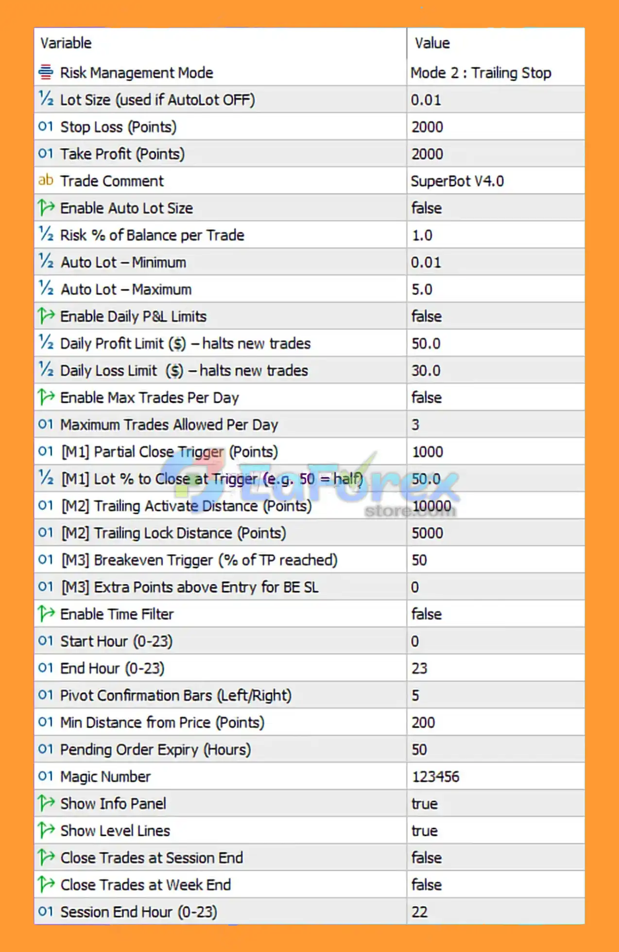 🔺SuperBot Live MT5 offers a balanced combination of risk control, trailing stop logic, and partial profit locking, making it suitable for both beginners and experienced traders. By using conservative settings like 0.01 lot size and 1% risk, you can maintain account stability while still benefiting from automated trading.This guide explains how to properly configure SuperBot Live MT5 on MetaTrader 5 for stable and optimized automated trading.
