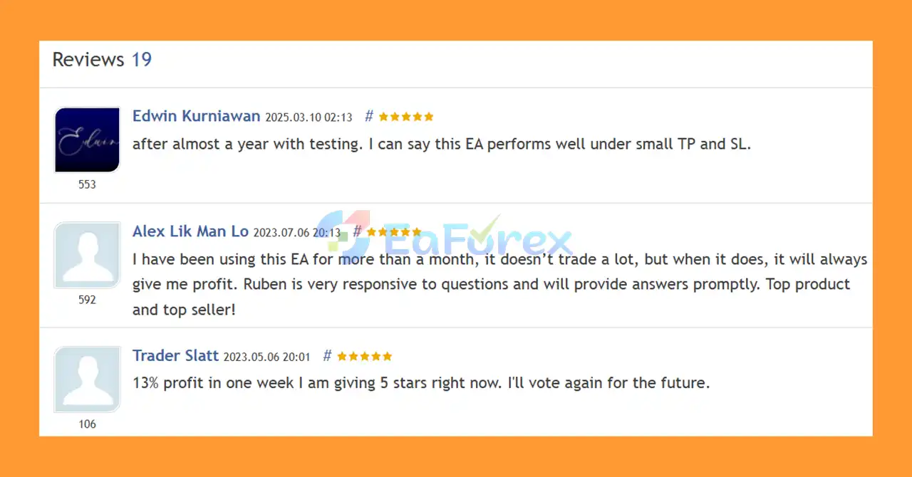 🔻Sydney MT5 is highly appreciated by the MQL5 community for bringing stable and reliable profits. Below are 5 star reviews from users: