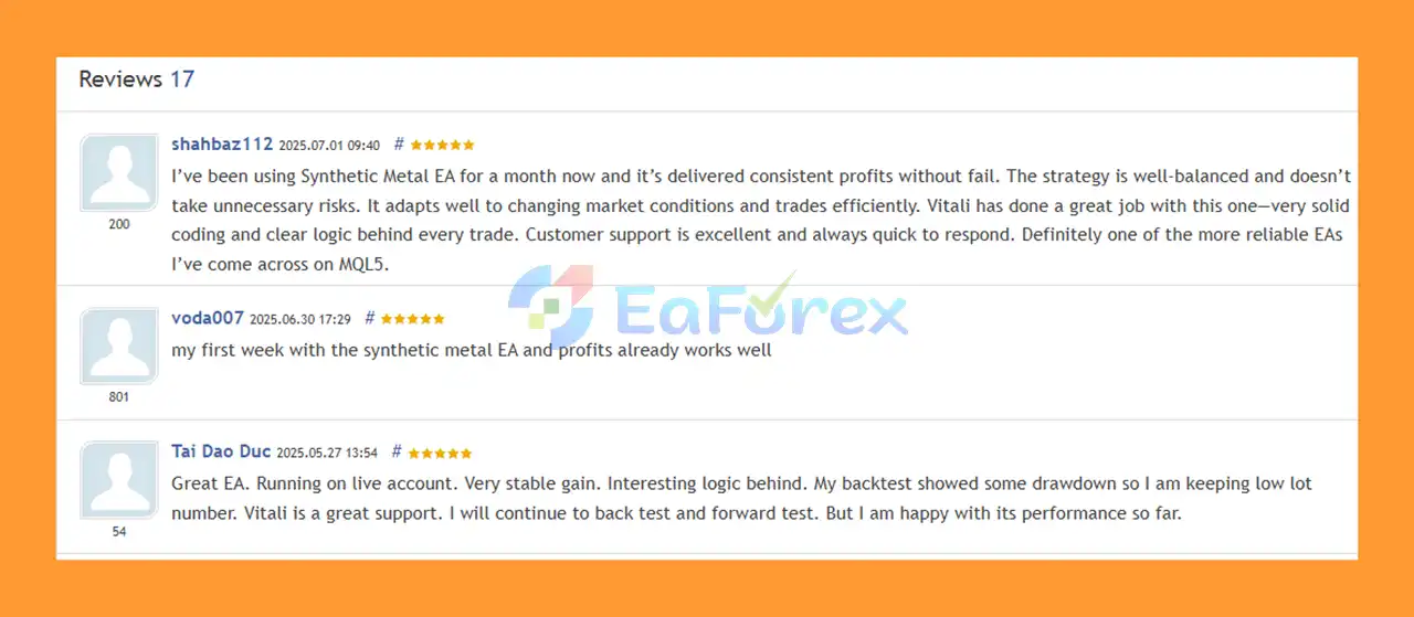 🔻Synthetic Metal EA MT5 is highly appreciated by the MQL5 community for bringing stable and reliable profits. Below are 5 star reviews from users: