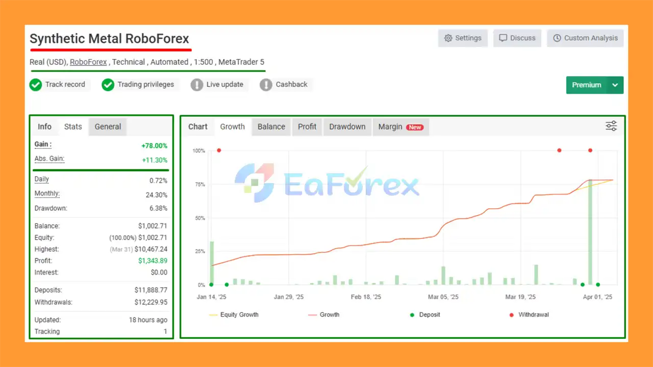 Verified performance (+78% total gain with only 6.38% drawdown).