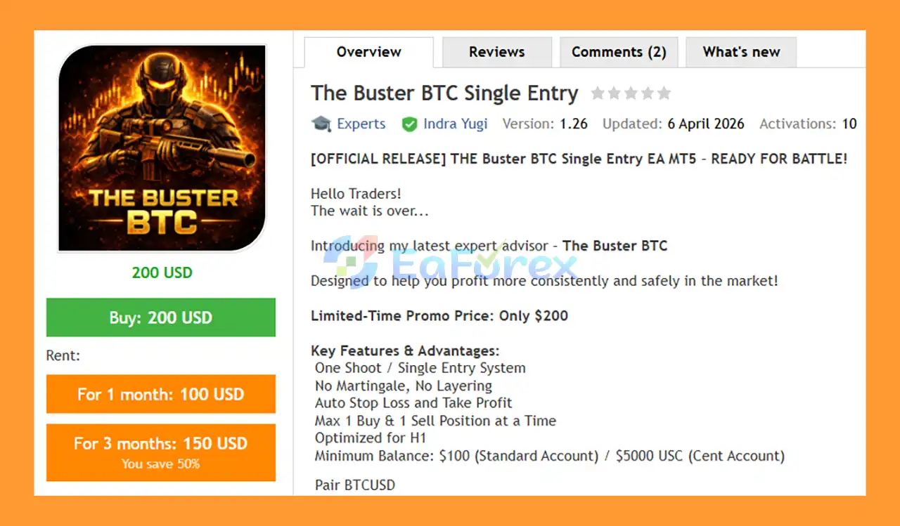 The Buster BTC Single Entry MT5 is an automated BTCUSD EA with single-entry H1 trades, no martingale/grid, auto SL/TP, and low-risk Bitcoin trading.