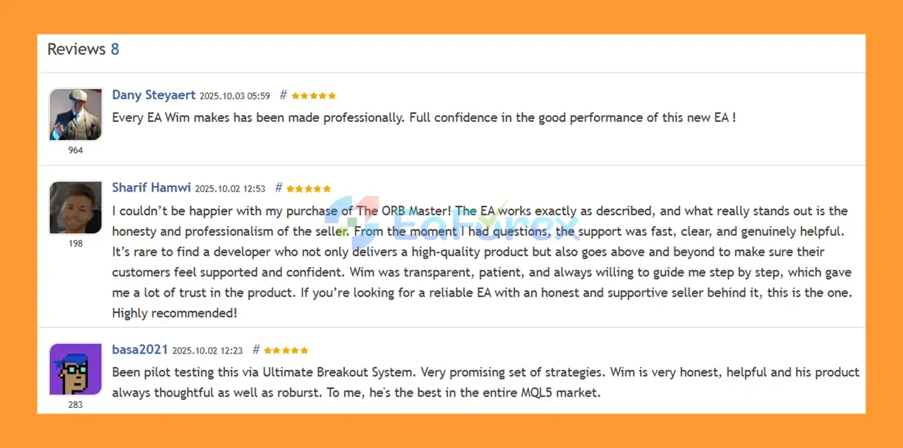 🔻The ORB Master MT5 is highly appreciated by the MQL5 community for bringing stable and reliable profits. Below are 5 star reviews from users: