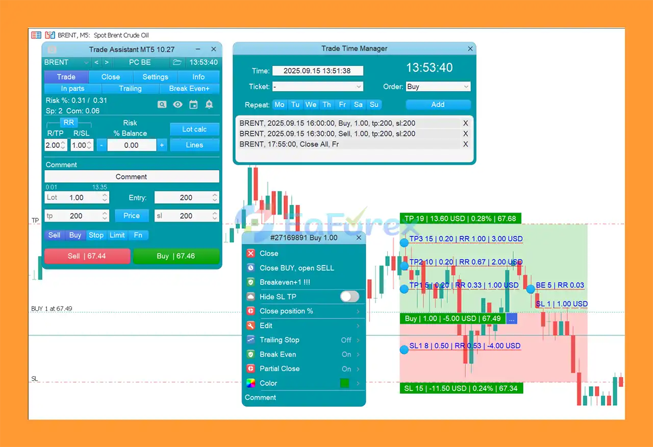 This tool supports market and pending orders, virtual SL/TP to hide levels from brokers, OCO (One Cancels Other) orders, partial closing, breakeven management, and automatic trade execution based on time or custom conditions.