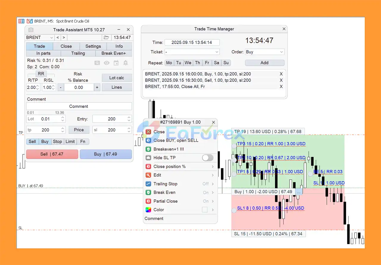In summary, Trade Assistant MT5 is an indispensable tool for traders who want to simplify order management, risk calculation and trade execution on MetaTrader 5. With advanced risk management features, including automatic lot size calculation, precise Stop Loss and Take Profit settings, partial order closing, breakeven and multiple trailing stop options, it allows traders to maintain stable and controlled risk on all trades. Additional features such as virtual SL/TP, OCO orders, symbol switching, keyboard shortcuts and automatic notifications ensure efficiency, speed and accurate trade execution in volatile market conditions.