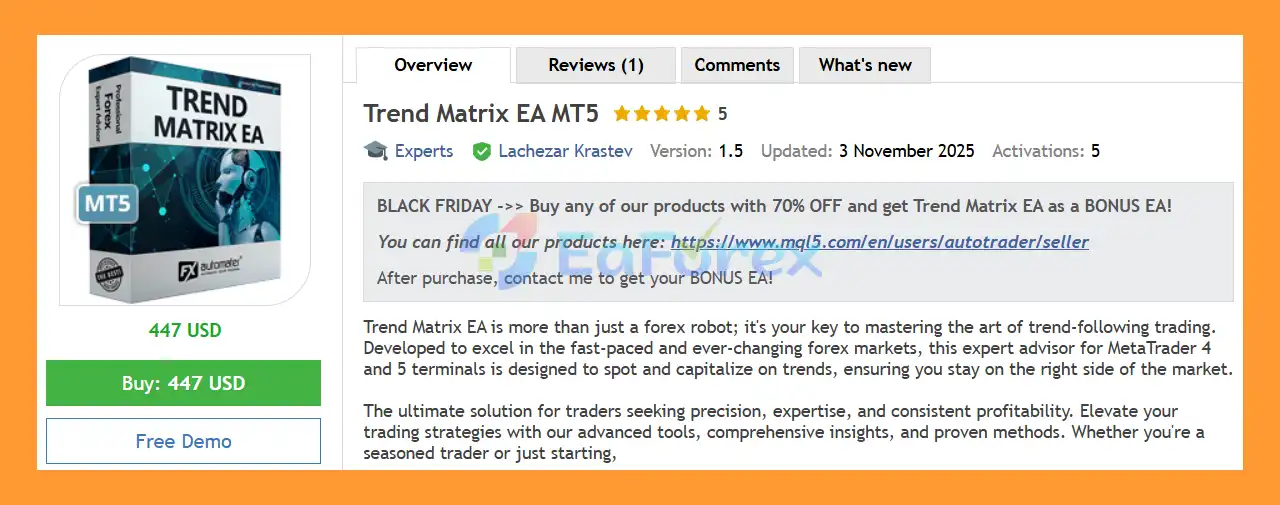 🔺Trend Matrix EA is highly appreciated by the MQL5 community for bringing stable and reliable profits. Below are 5 star reviews from users: