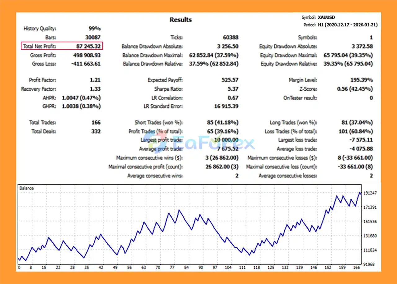The EA follows a “quality over quantity” philosophy. It typically targets 20–40 high-probability trades per year per symbol, making it suitable for swing and position traders rather than scalpers.