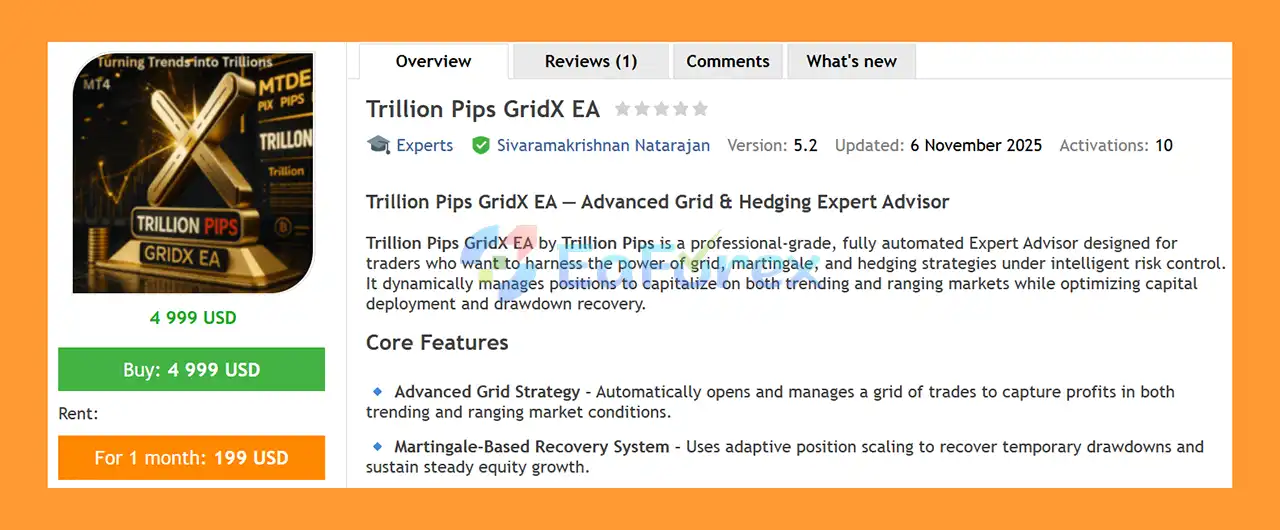 • Notable Products: Trillion Pips GridX EA MT4, Trillion Pips X EA and other advisors.