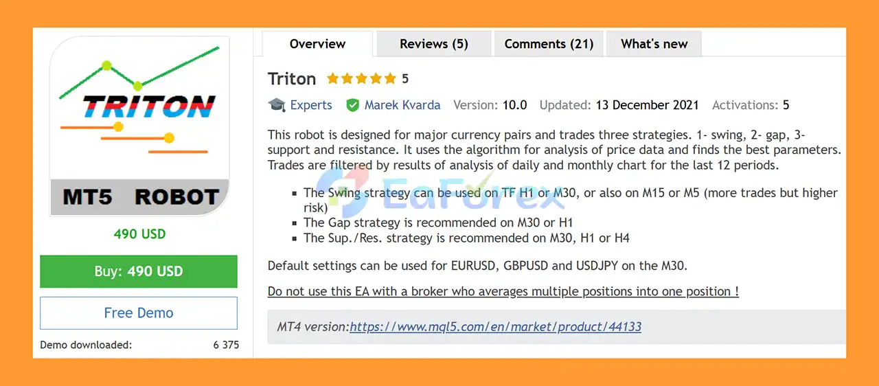 Triton EA MT5 was developed by Marek Kvarda, an experienced MQL5 programmer with over 9 years of expertise. He is also known for other popular trading robots such as Megatron MT4, Forebot MT4, FXbot MT4, and Edger MT4.