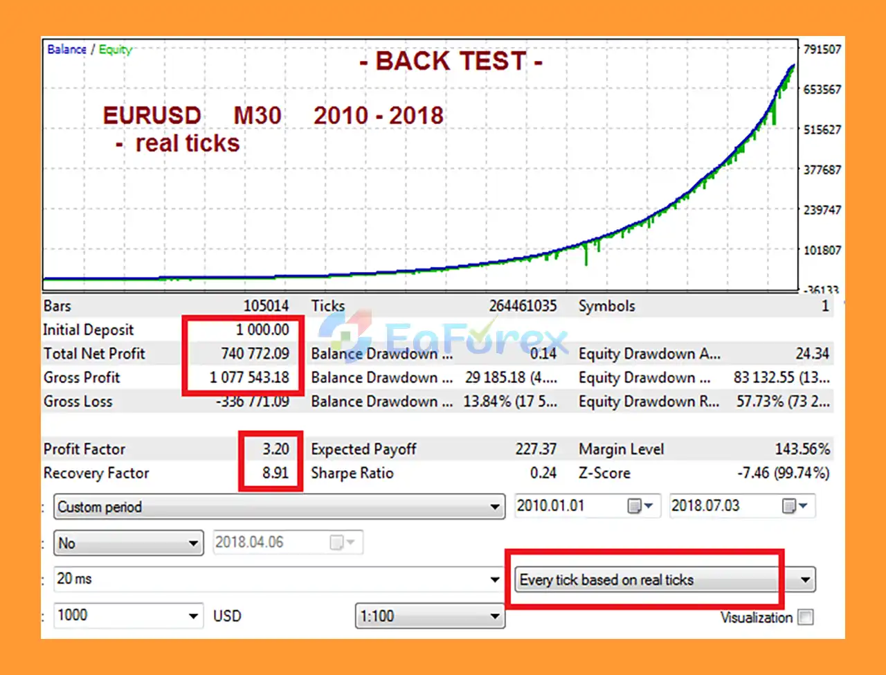 EURUSD (8 years): $1,000 → $740,772.09, Drawdown: 13.84%