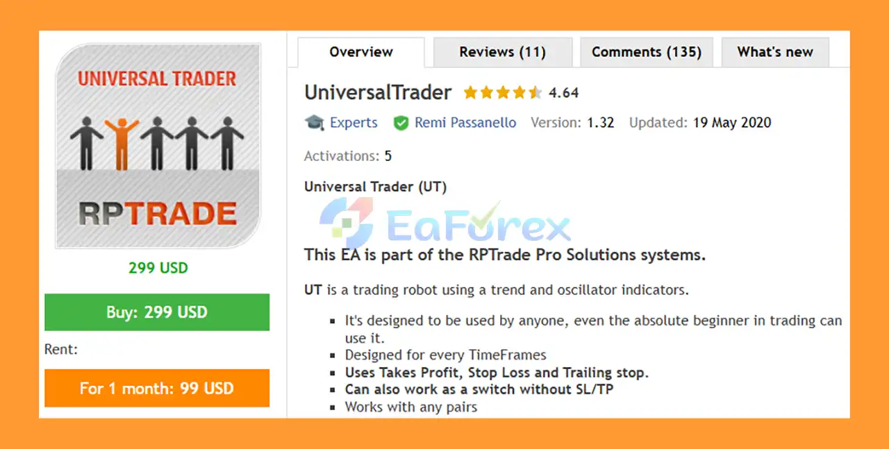 UniversalTrader EA MT5 is a fully automated trend-tracking Expert Advisor (EA) within the RPTrade Pro Solutions ecosystem, developed for MetaTrader 5. It combines trend and oscillator indicators to provide structured, rule-based trading suitable for both beginners and experienced traders across all timeframes and currency pairs.