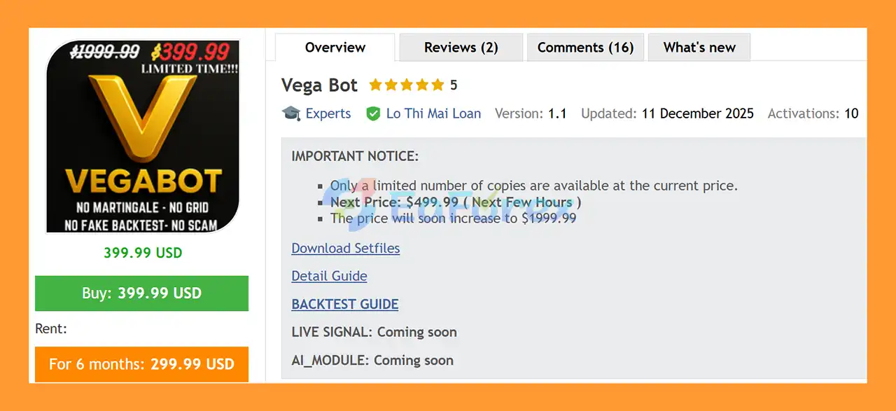 In summary, Vega Bot MT5 is a professional, multi-strategy, trend-following Expert Advisor designed for Forex, Gold, Indices, and Cryptocurrency trading. With over 10 built-in strategies, a custom strategy builder, and full multi-timeframe support, it allows traders to create personalized, high-probability trading systems without programming knowledge. The EA emphasizes disciplined risk management with stop loss control, avoids high-risk methods like Martingale or Grid, and is fully compatible with prop-firm rules. Backtested and optimized for long-term growth, Vega Bot MT5 delivers a flexible, stable, and reliable solution for traders seeking professional, all-in-one automated trading across major markets.