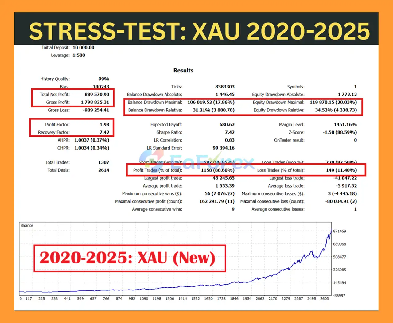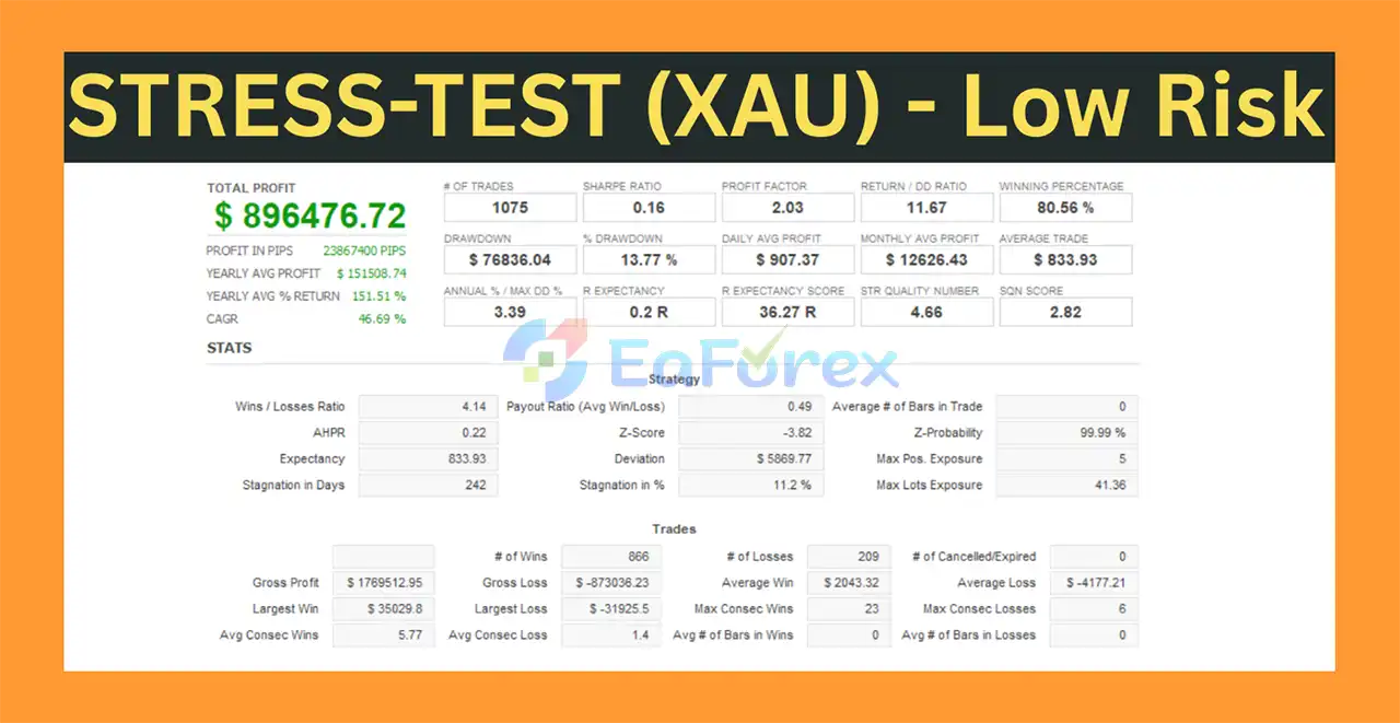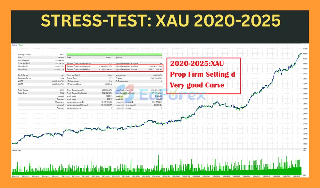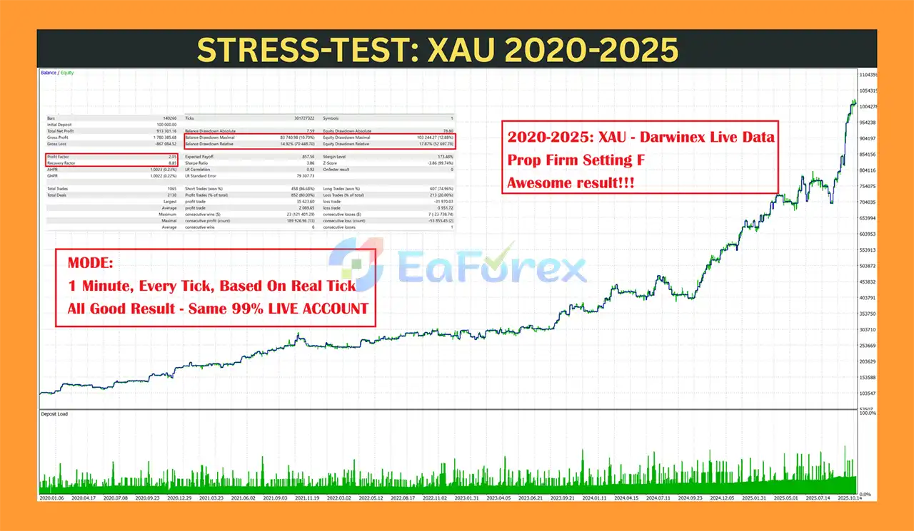 Backtests show strong results, for example, on XAUUSD (Gold) with a $10,000 initial deposit over 5 years, it achieved $1.2 million net profit, an 88.32% win rate, and a maximum drawdown of 16.10%.