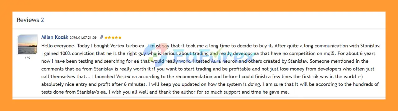 🔺 Vortex Turbo EA is highly appreciated by the MQL5 community for bringing stable and reliable profits. Below are 5 star reviews from users: