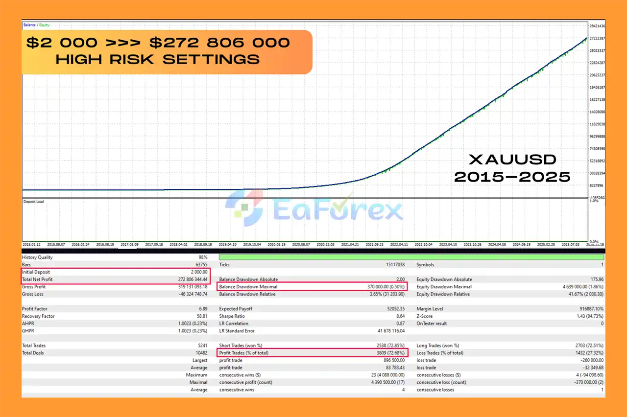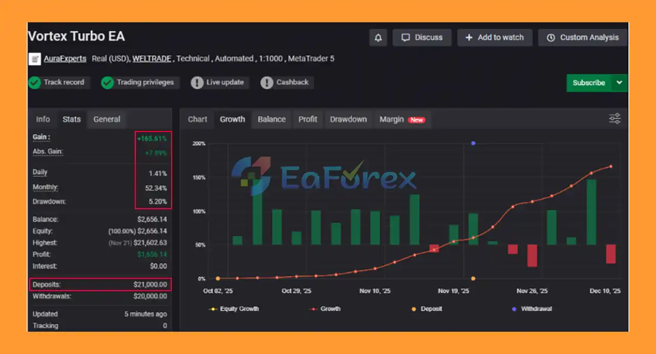 Based on Myfxbook and signal results, Vortex Turbo EA MT5 has demonstrated strong growth rates, high win percentages, and relatively low drawdown, along with 10-year backtest consistency on XAUUSD.