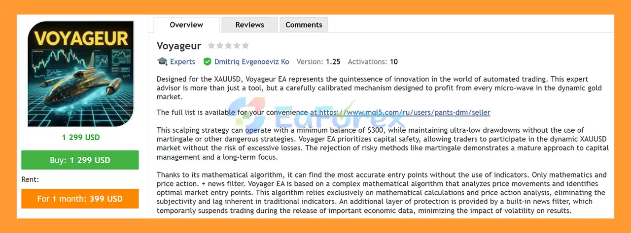 In summary, Voyageur EA MT4 is a precision-driven gold scalping Expert Advisor built exclusively for XAUUSD on the MT4 platform. By using pure mathematical and price action logic instead of traditional indicators, and by completely avoiding martingale, grid, or averaging strategies, it delivers ultra-low drawdown and exceptional capital protection. With its micro-wave scalping approach, built-in news filter, and suitability for small accounts, Voyageur EA MT4 is an ideal solution for traders seeking stable, disciplined, and long-term gold trading automation.
