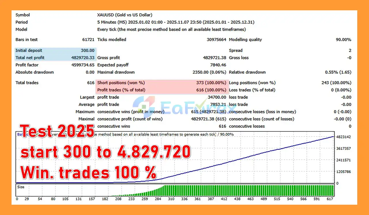 The EA can operate from a minimum balance of $300, making it suitable for small accounts while maintaining strict exposure control and ultra-low drawdown behavior.