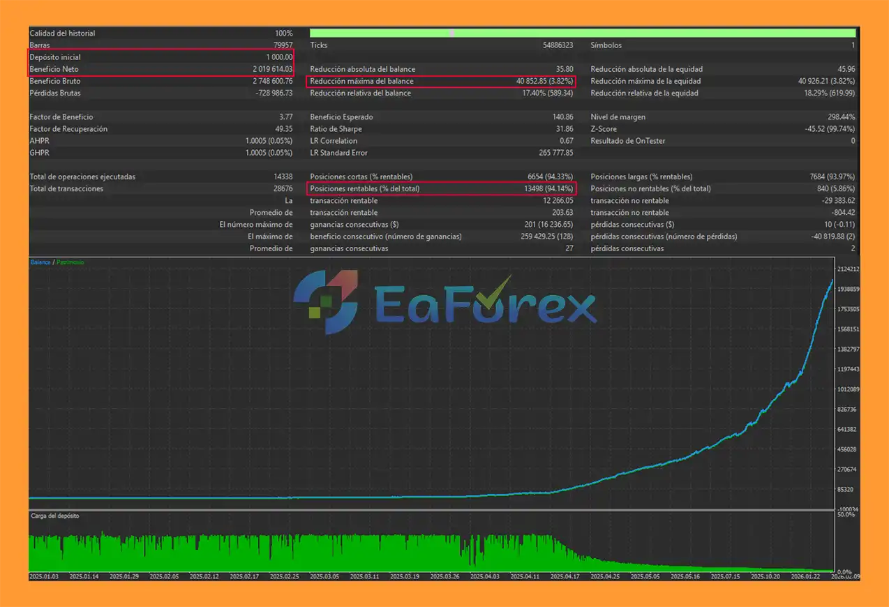 Backtests show exceptional performance with an initial deposit of $1,000 generating over $2 million in net profit, a 94.14% win rate, and a low maximum drawdown of 3.82%.