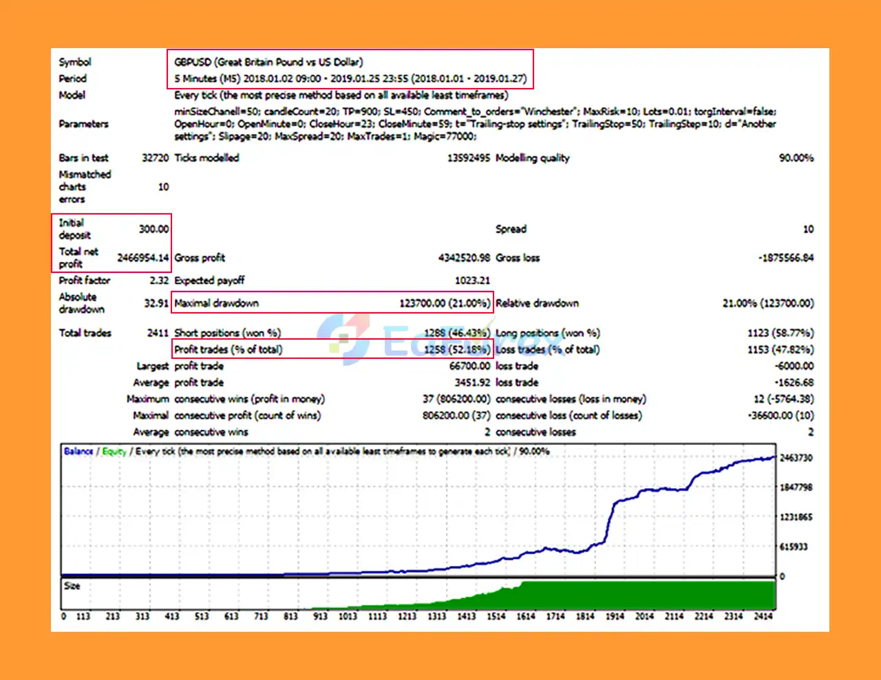 GBPUSD – 13 months: $2.47 million net profit, 52.18% win rate, 21% max drawdown