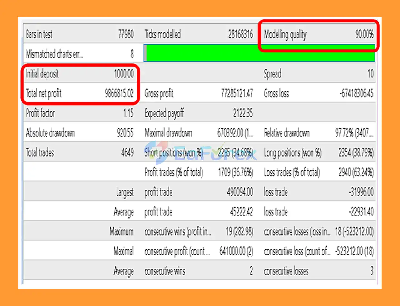 A backtest on XAUUSD (Gold) with a $1,000 initial deposit yielded a total net profit of $9.86 million with a maximum drawdown of 12.79%, demonstrating high profitability with controlled risk.