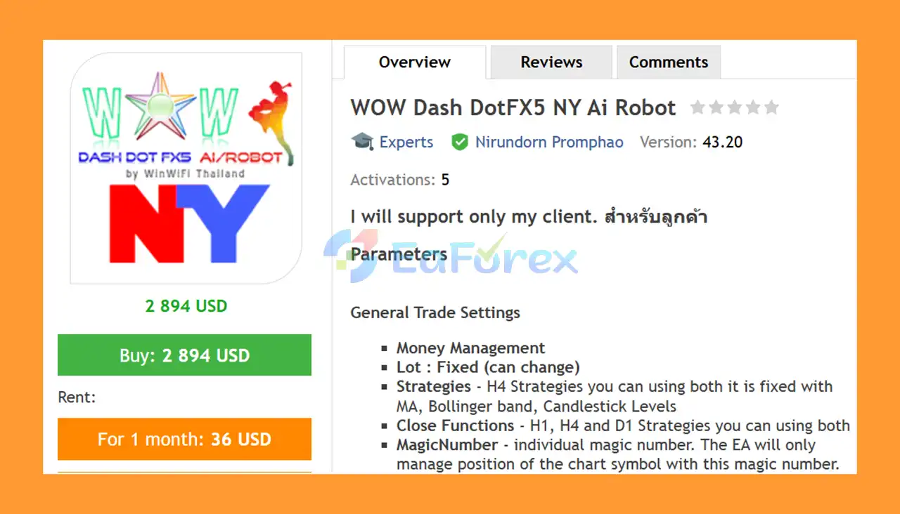 • Notable Products: WOW Dash DotFX5 NY Ai Robot EA MT4, Win Sniper Follow EA MT4, Multi Gold Ai Robot, Candy Ai Robot, Ava Ai Robot, WinWiFi Fund Ai Robot, Fullerton Fund Ai Robot and other advisors.