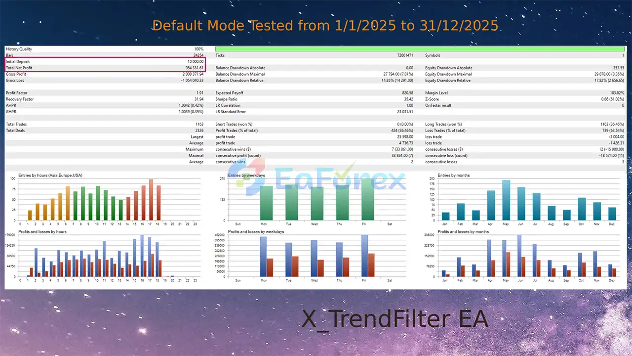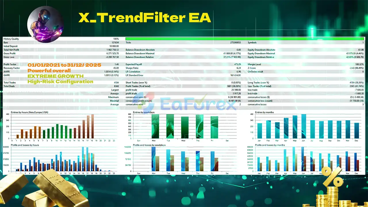 X TrendFilter EA MT5 uses multi-layer market filtering, evaluating trend strength, volatility quality, spread, session timing, and market conditions before executing trades to ensure statistically sound setups.
