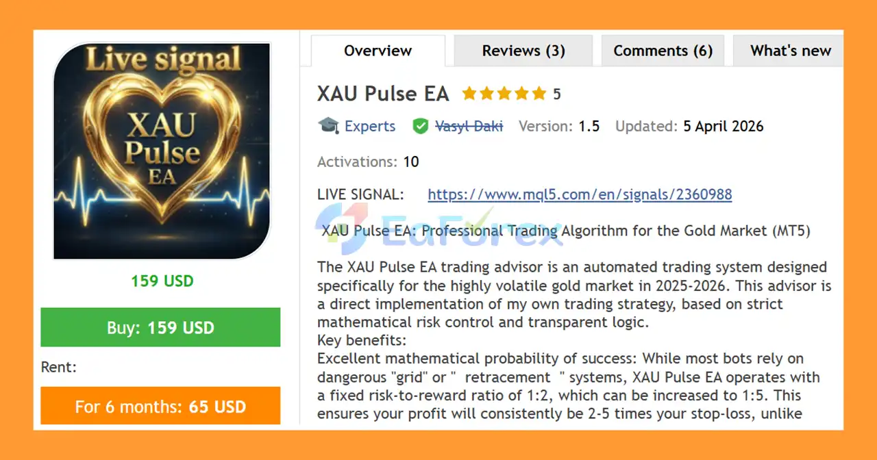 XAU Pulse EA MT5 is an automated trading system designed for trading XAUUSD (Gold) on MetaTrader 5. It uses a mathematics-based strategy with fixed risk-to-reward ratios to deliver consistent profits while prioritizing capital preservation.