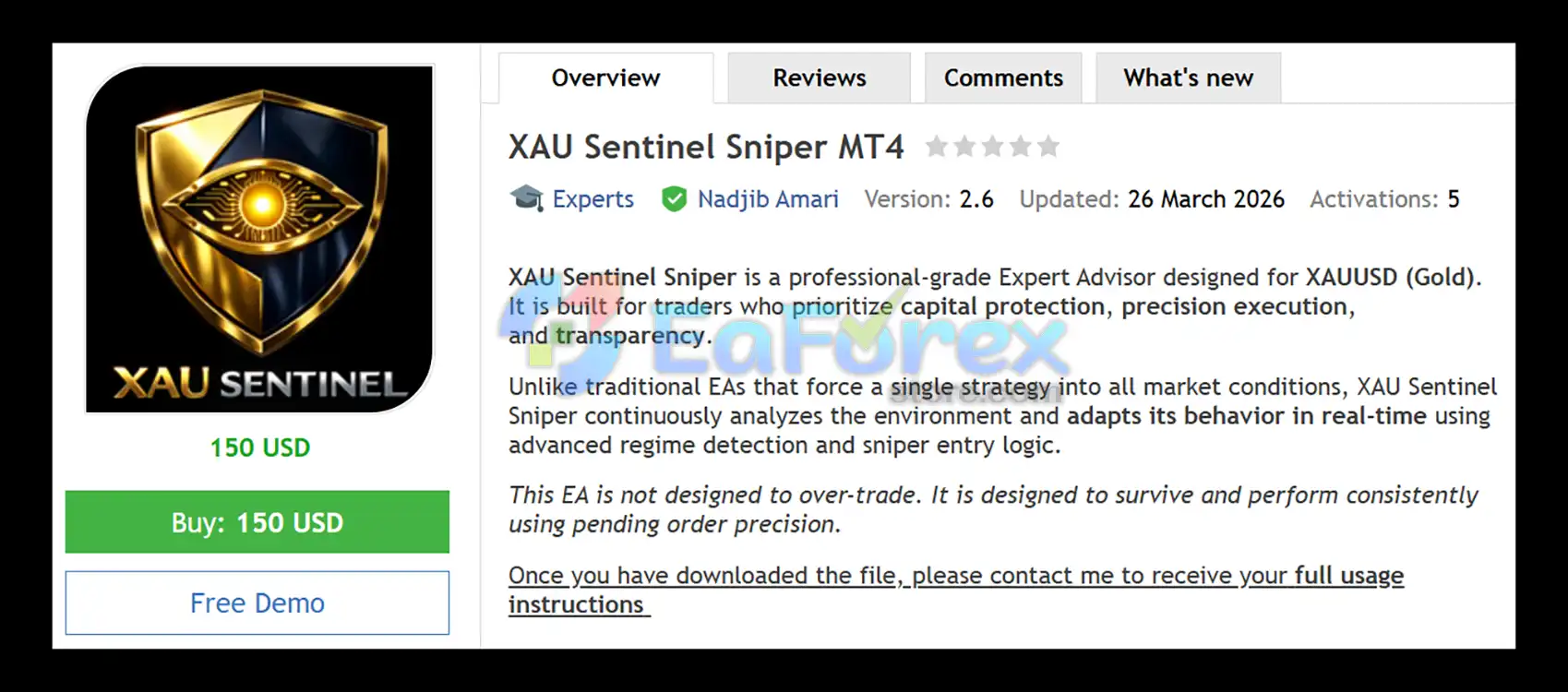 In summary, XAU Sentinel Sniper MT4 stands out as an advanced and reliable Expert Advisor (EA) for XAUUSD trading, combining adaptive intelligence, precise entry capabilities, and robust risk management. Powered by the Adaptive Market Regime Engineâ„¢ (AMREâ„¢), the system automatically adjusts to changing market conditions, ensuring stable performance while prioritizing capital protection. With features like Smart Risk Matrixâ„¢, Equity Guardâ„¢, and multi-indicator confirmation, it offers a balanced approach to profitability and safety. For traders seeking a professional, disciplined, and not overly risky gold trading solution, the XAU Sentinel Sniper MT4 is a powerful choice, well worth optimizing for long-term trading success.